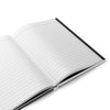 The notebook lay open in his lap, pregnant with 150 lined paper pages. Soft cover. Glue-bound laminated cover with matte finish. Dark as the sky. Its pages waited, steady, while the night pressed in.